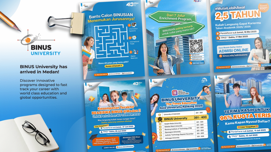Untuk mencapai tujuan tersebut, BINUS@Medan menggandeng Solutive dalam merancang strategi pengelolaan media sosial yang menekankan storytelling, konten interaktif, dan pendekatan visual yang segar. Semua elemen dirancang agar pesan kampus baru ini terasa relevan, otentik, dan mudah diterima oleh audiens.